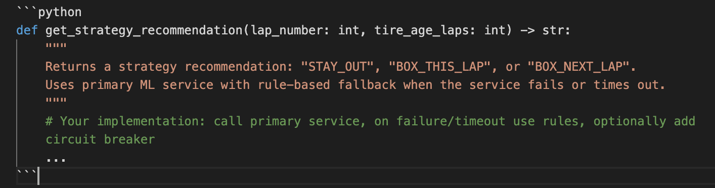 One of the most demanding factors in F1 is reliability under pressure: when the primary ML strategy service is slow or down, the pit wall still needs a recommendation. This exercise implements a simple circuit breaker with a fallback-a pattern that MLOps uses to keep systems reliable when dependencies fail.