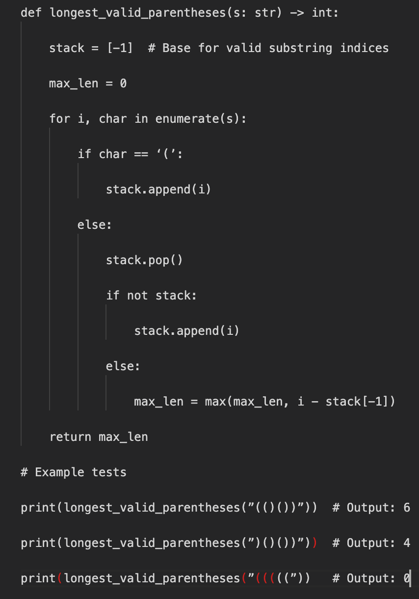 ‘)’matches a‘(’, compute the current valid substring length.Update